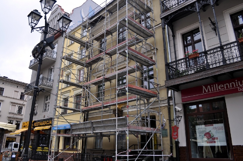 Remont elewacji zabytkowej kamienicy w Toruniu. Realizacja został‚a wykonana przy współ‚pracy z konserwatorem zabytków.